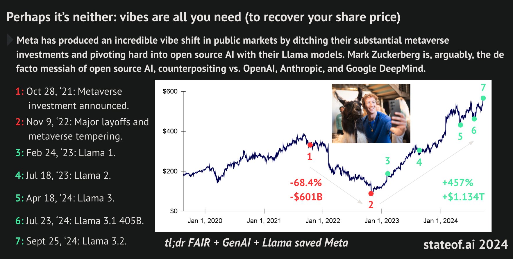 Simping has reached its zenith. Tech-savvy bros morph into submissive followers, idolizing the gods of the Silicon Valley, nostrils closed to the stench of pissed street corners that might jar their VR headsets. Yes, Meta is amazing. Their research is of the highest quality. But the company’s 5D chess game serves only its own long-term interests. Meta portrays itself as doing god’s work by playing the OS card, instilling short-term hope, feigning altruism, and feeding us crumbs of groomed-Zuck’s “magnanimity” while he’s openly building the future of the world. “There’s nothing more deceptive than an obvious fact.”