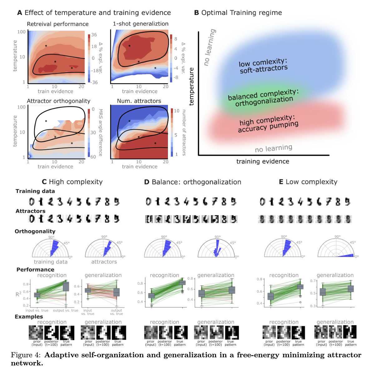 A core finding: these FEP-driven networks spontaneously develop approximately orthogonal attractor states. This means the stable patterns the network learns (its “concepts”) are largely distinct and non-overlapping.
